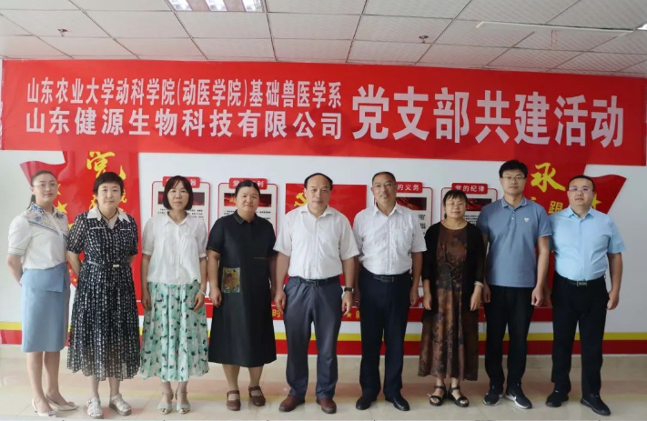 2023年8月26日, 山東農業大學動科學院(動醫學院)基礎獸醫學系與山東健源生物科技有限公司開展黨支部共建活動,山東農業大學郭慧君教授、邱建華副教授、侯秋玲教授、肖一紅教授、蔡玉梅教授、王剛教授、王春陽副教授,山東健源生物科技有限公司董事長王誠以及研發部相關負責人參加此次黨建共建活動。
