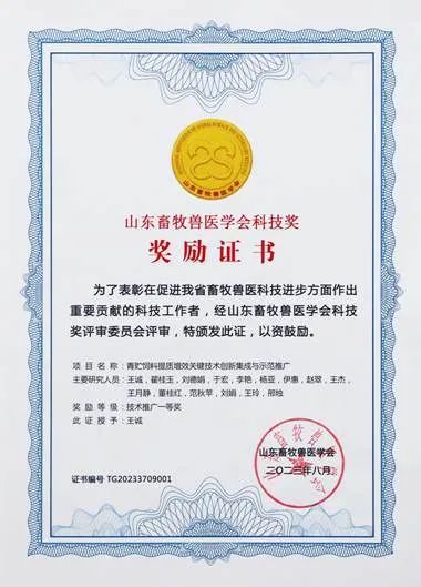 該獎項由山東畜牧獸醫學會設立,根據《山東畜牧獸醫學會科技獎獎勵辦法(試行)》的規定,經山東畜牧獸醫學會科技獎勵工作委員會評審,對為我省畜牧獸醫事業科技進步和創新做出突出貢獻的集體和個人給予的獎勵。