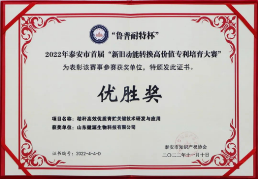 2023-4-4 祝賀山東健源生物榮獲2022年泰安市首屆“新舊動能轉換高價值專利培育大賽”優勝獎