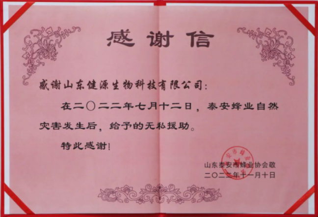 2023年4月11日,山東健源生物科技有限公司收到來自山東泰安市蜂業協會的一封感謝信和一面錦旗,...