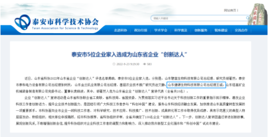 山東健源生物董事長王誠榮獲2022山東省企業(yè)“創(chuàng)新達人”稱號